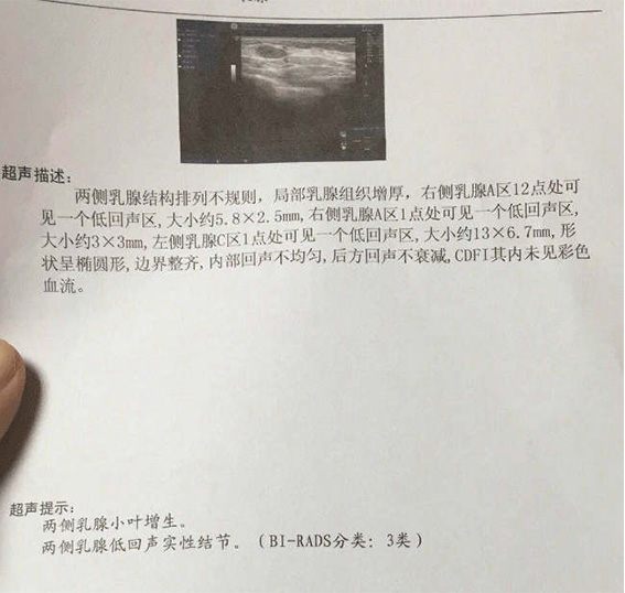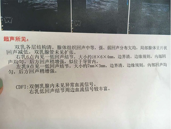 近几年结了婚开始婚后日子,我才再一次想起来我的乳房有增生这回事。好几次和老公亲热的时候被摸胸都感觉特别的疼,比以往疼得厉害,我以为是老公太用力,疼的很,被老公强行拉去医院又做了一次乳腺检查 。这一检查把我给吓蒙了,检查结果是双侧乳腺低回声结节BI-RADS 3级,乳房还有3个硬块,大的13mm*6.7mm了。我知道我的乳腺增生严重了,而且医生说硬块可能会继续长大,并给了方案,但会在胸上留下疤痕,而且有复发的可能,让我和老公考虑好。我说我先回家和老公商量一下。